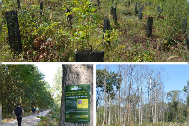Nous avons appris que les Châtaigniers, qui représentent un tiers des espèces dans la forêt sont en train de mourir de la maladie de l’Encre. Ce pathogène détruit le système racinaire ce qui provoque le dessèchement des rameaux. En effet cette maladie s’est aggravée plus particulièrement ces 3 dernières années suite aux grandes pluies de 2016 suivies des périodes de sècheresse très prolongées et des hivers très doux entre 2017 et 2020.