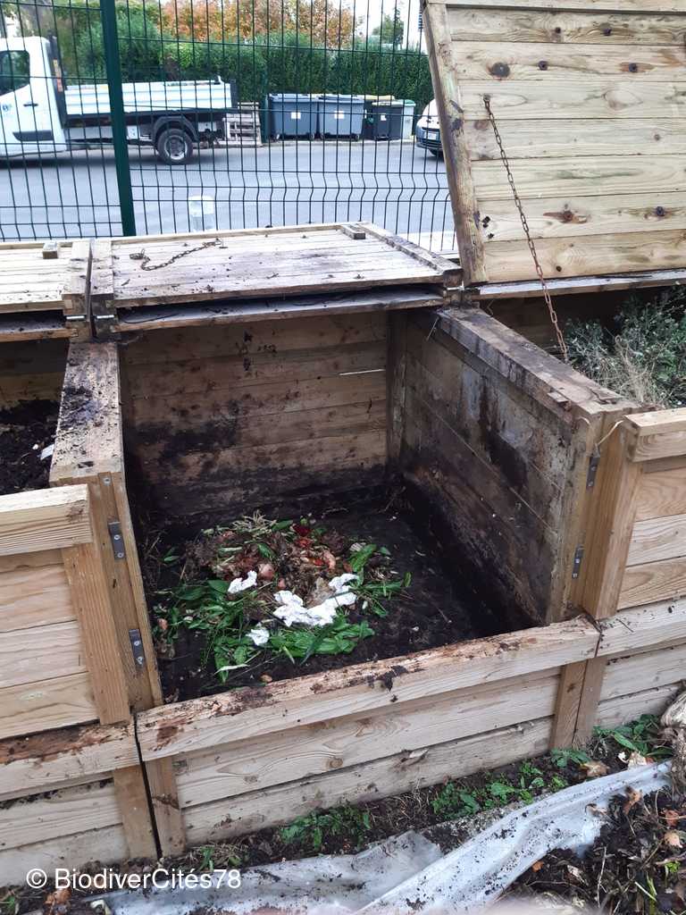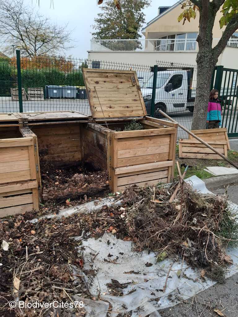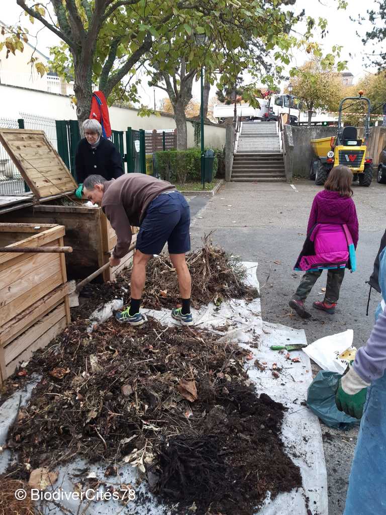Lundi 23 Octobre : BiodiverCités78 a réalisé un entretien des composteurs place de la mairie.
